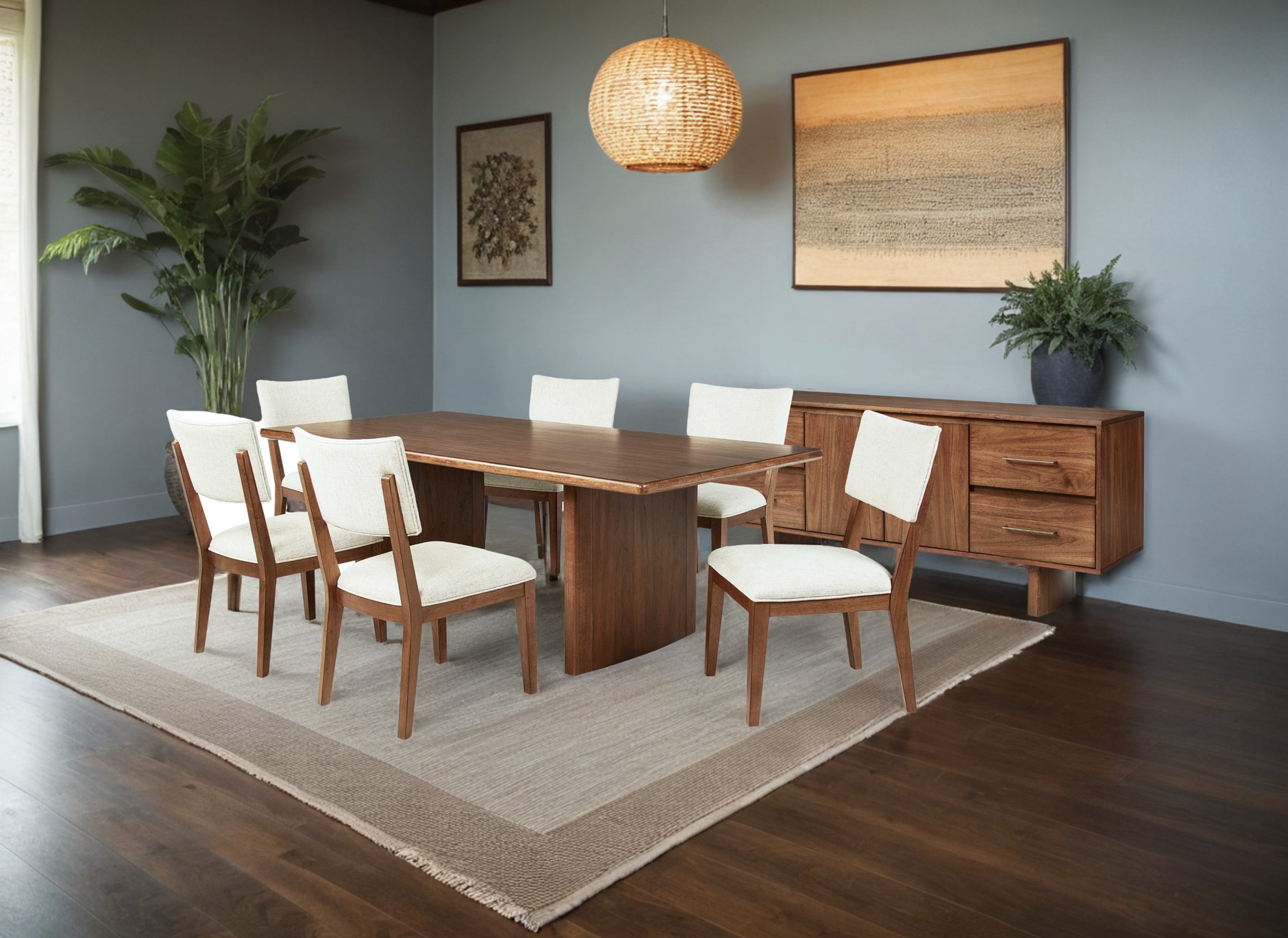 Bring timeless elegance and refined comfort to your dining space with the Aspen 7-Piece Dining Set. Expertly crafted with mid-century modern influences, this set includes a beautifully finished solid wood table and six matching chairs. Each piece is made from rich, warm-toned walnut wood that showcases natural grain patterns, giving every set a unique character.