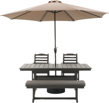 Bring effortless style and everyday durability to your outdoor dining space with the Jean 7-Piece Outdoor Dining Set. Designed for relaxed gatherings and lasting comfort, this complete set includes a spacious dining table, four arm chairs, a coordinating bench, and an umbrella—everything you need to enjoy meals outdoors in comfort and style.