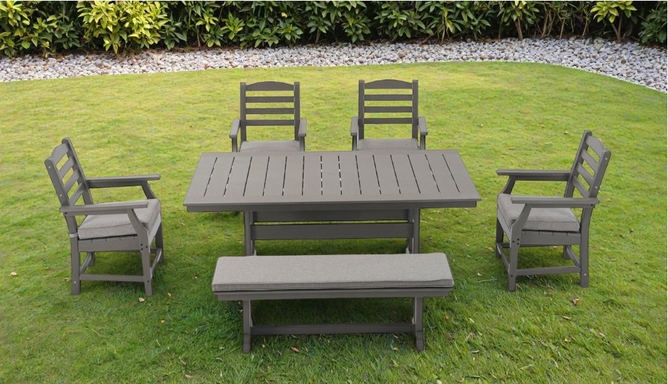 Crafted from high-density polyethylene (HDPE), the Jean set is built to stand up to the elements while maintaining its clean, polished look. The chairs feature supportive armrests for added comfort, while the bench provides flexible seating for guests of all ages. Finished in a beautiful neutral tone, this set blends seamlessly with a wide range of outdoor décor styles, from modern patios to casual backyard spaces.