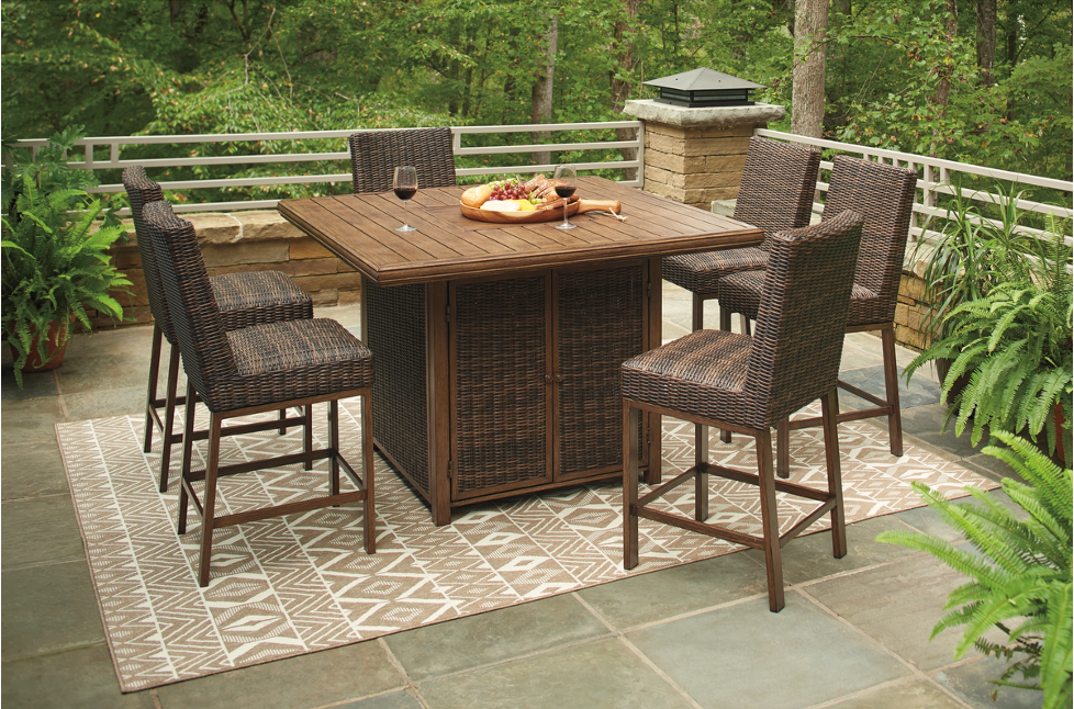 The square table creates an inviting gathering spot, while six armless wicker-style stools provide comfortable, casual seating that easily tucks under the table when not in use. The warm woven texture paired with the sturdy frame gives the set a relaxed yet refined look that works beautifully on patios, decks, and outdoor kitchens.