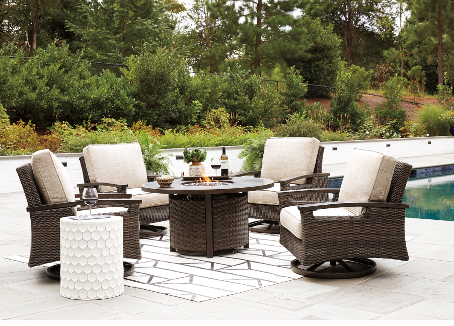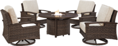 The smooth swivel motion lets guests turn easily to join conversations, while the cushioned seating ensures lasting comfort for long evenings outdoors. At the center, the fire pit table adds both warmth and atmosphere, making this set ideal for everything from casual family nights to hosting friends under the stars.
