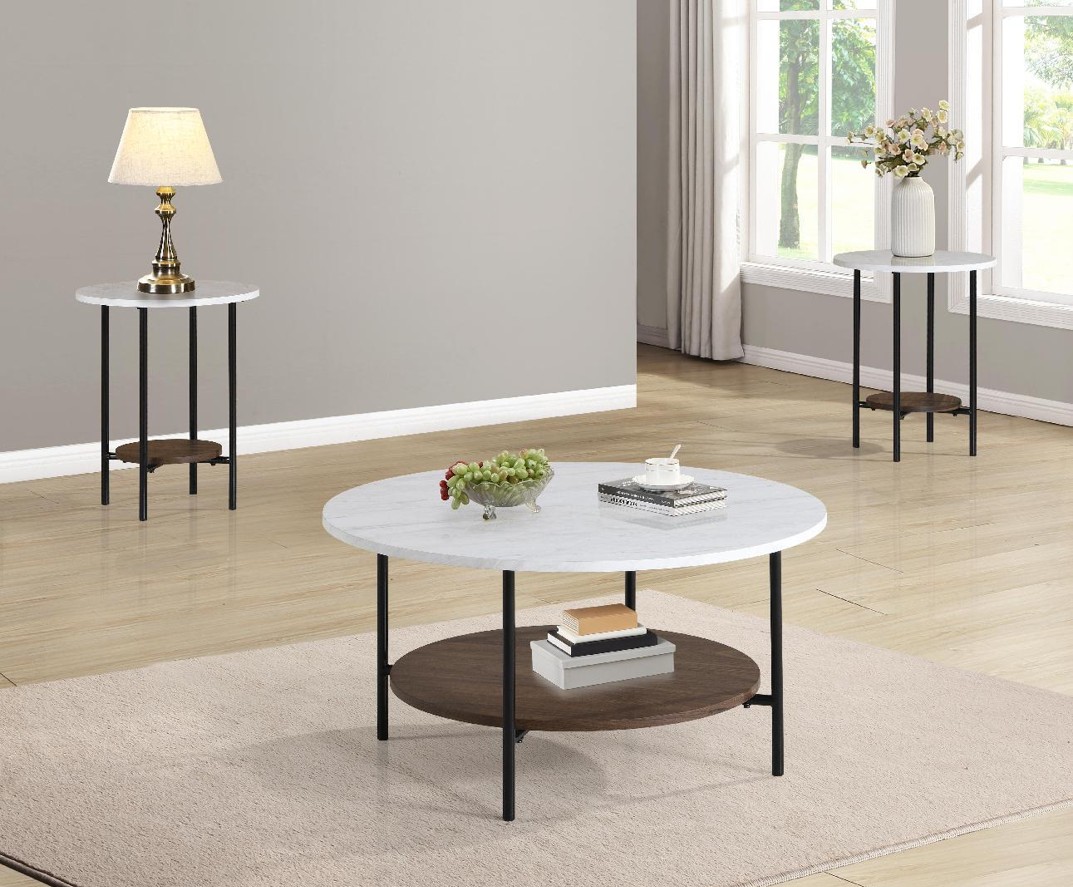 At the center of the grouping, the round coffee table (34″ diameter × 18″ H) offers a welcoming surface perfect for entertaining, displaying décor, or anchoring your sofa and seating arrangement. Complementing it are the round end tables (18″ diameter × 23″ H), perfectly sized to sit beside chairs or couches, placing lamps, beverages, or your favorite books right where you need them most.